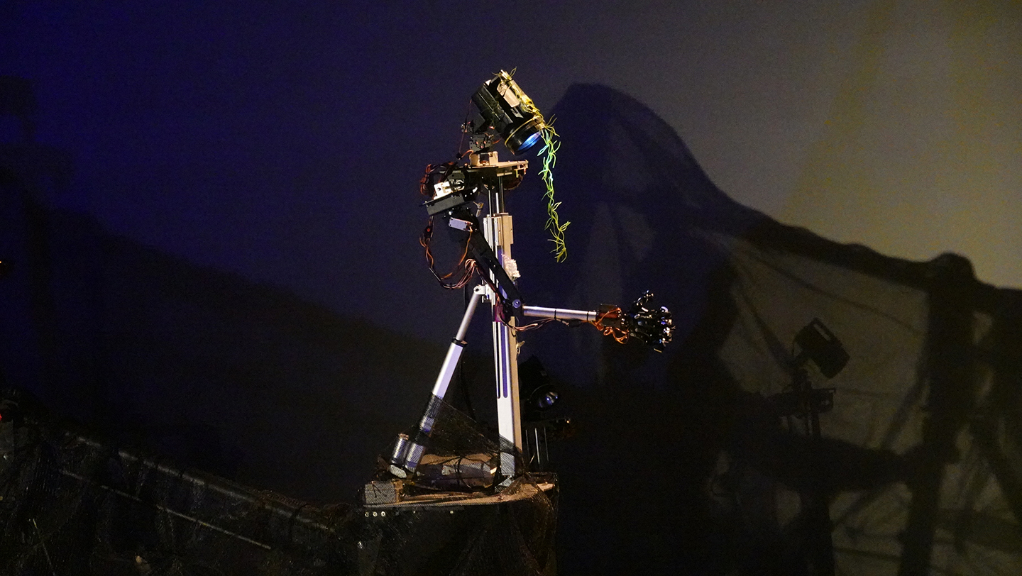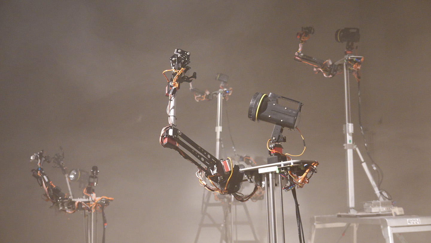 Machines that resemble humans scramble along the lines of light that are reduced to shadows. The rugged, clunky movement of the deformed onearmed robot out of symmetry raises the illusion of ‘human familiarity’ to us through the process of overlapping, distorting and composing shadows. Robots that operate as automated stage equipment and characters evoke an unstable future, such as the restraint of a machine not far from the future, but in reality they are constrained machines in human control. Designed with the memory of colleagues in the 90s club scene and the alienated people in the streets, these robots dance and sing to each other in limited gestures. Developed with five members of the creative team, this play explores the possibilities of a new genre of robotic mechanical theater.